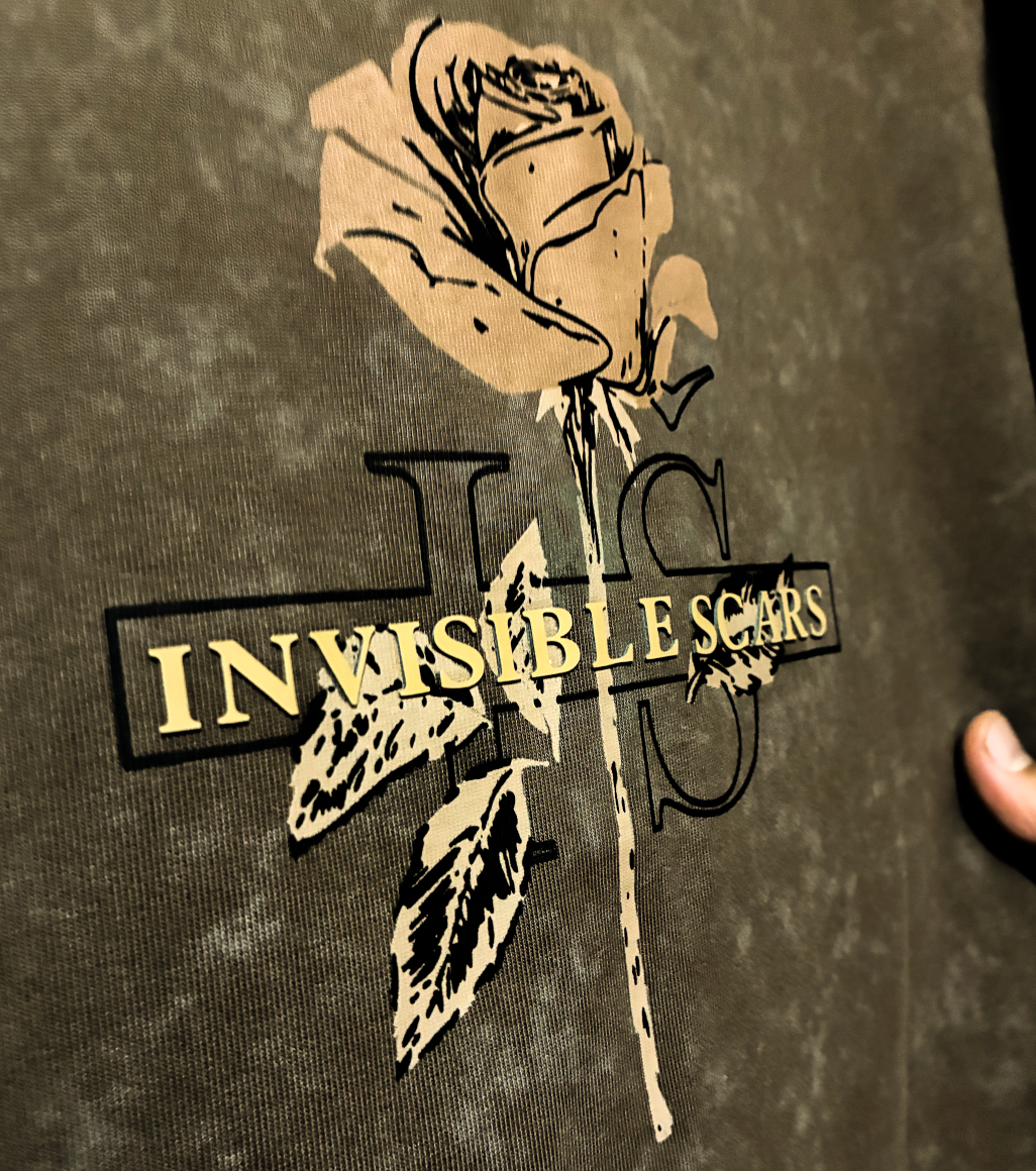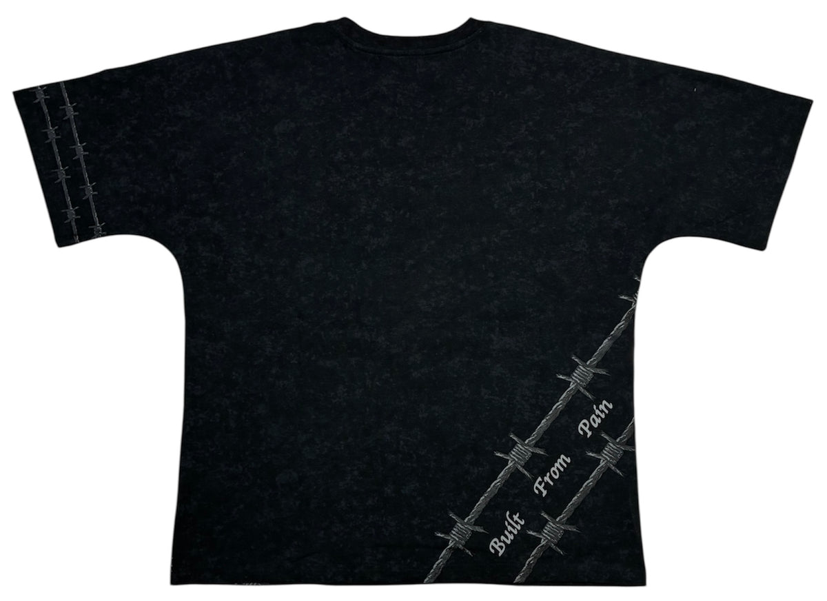 Oversized box tee with rubberized Invisible Scars logo and rose chest graphic. Finished with diagonal barbed-wire detail at the hem and “Built From Pain” back print.