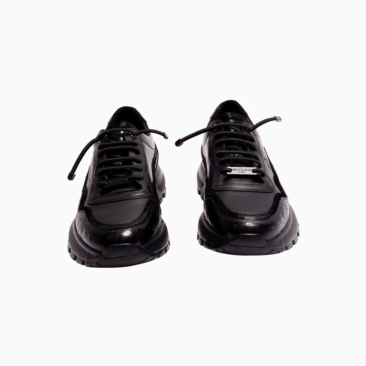 Introducing the Privilege Society Monogram Leather Heritage Sneaker: a sleek, all-black leather masterpiece accented with silver-tipped laces and subtle suede details. Embossed with our signature monogram along the side, this sneaker embodies timeless elegance and a heritage of refined craftsmanship.