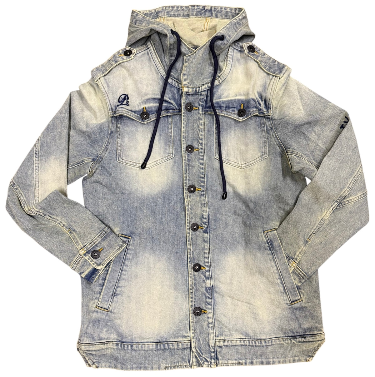 Introducing the Trailblaze Denim Hoodie Jacket. With a lighter wash and the same signature PS details, this jacket combines a relaxed vibe with a bold edge. Featuring an attached hoodie, "IYKYK" embroidery on the sleeve, and the Privileged Society name on the back, it’s made for those who forge their own path.