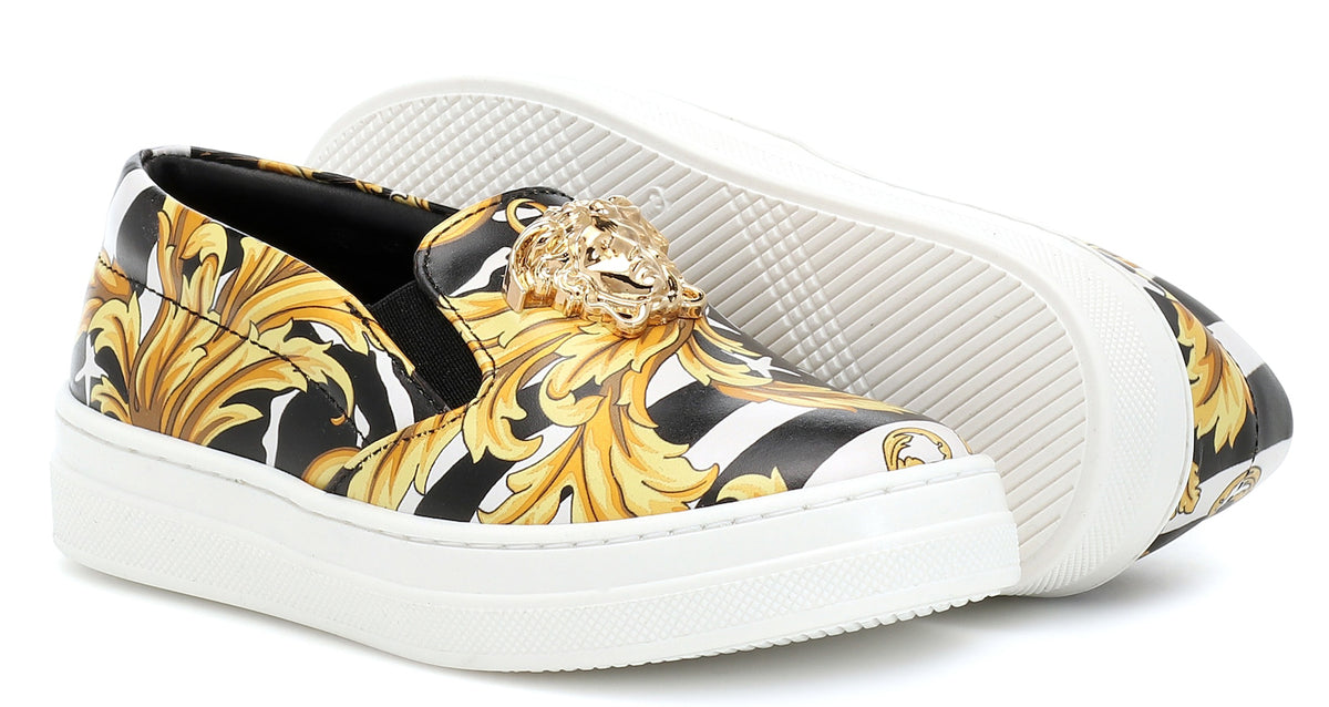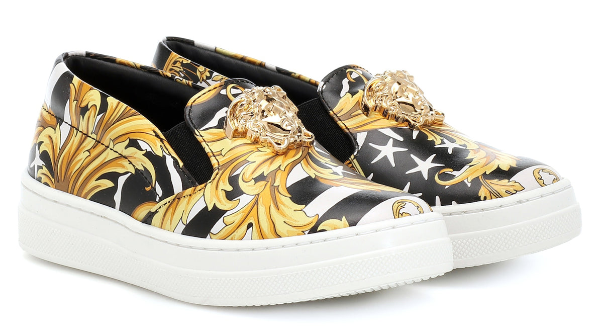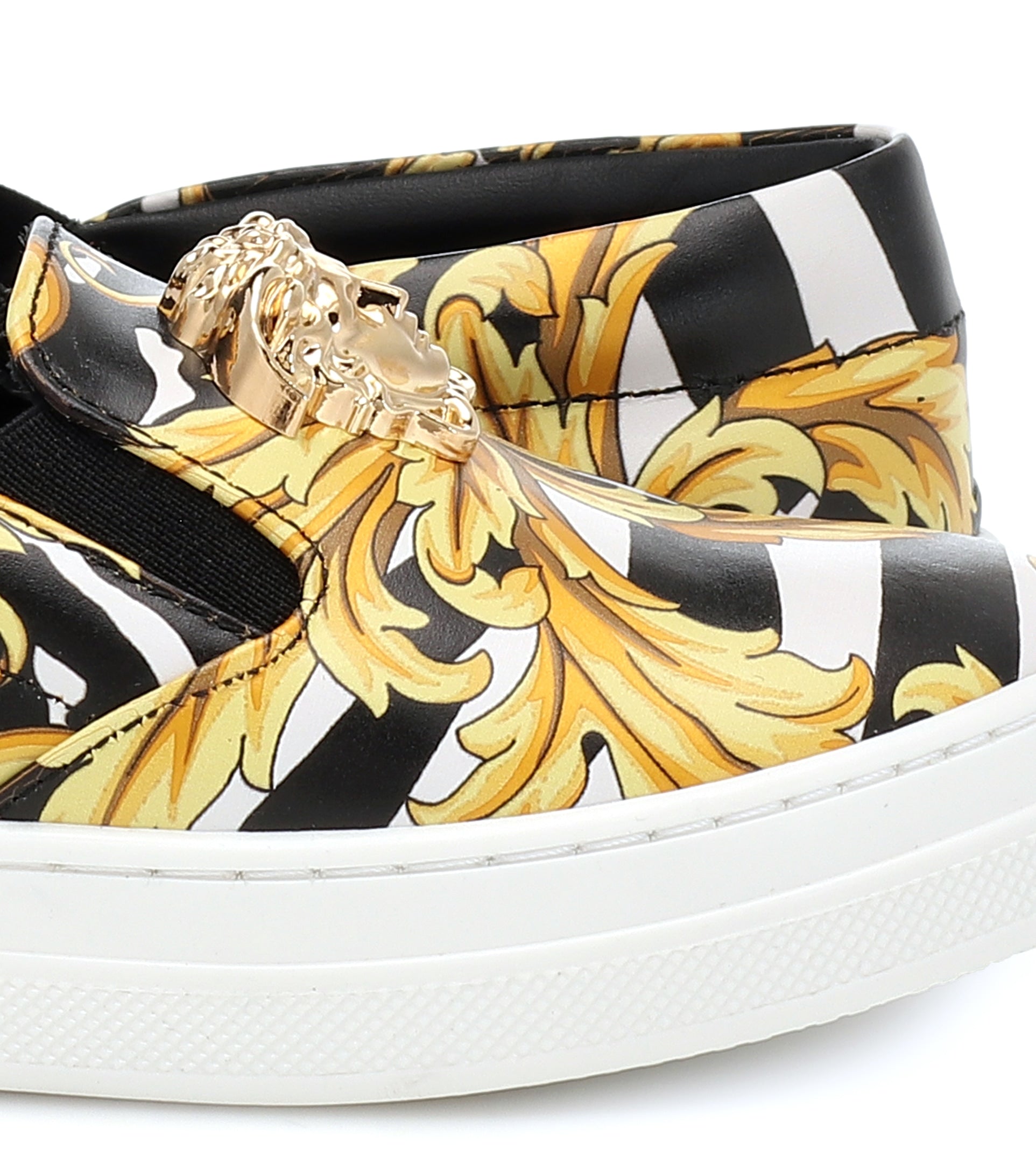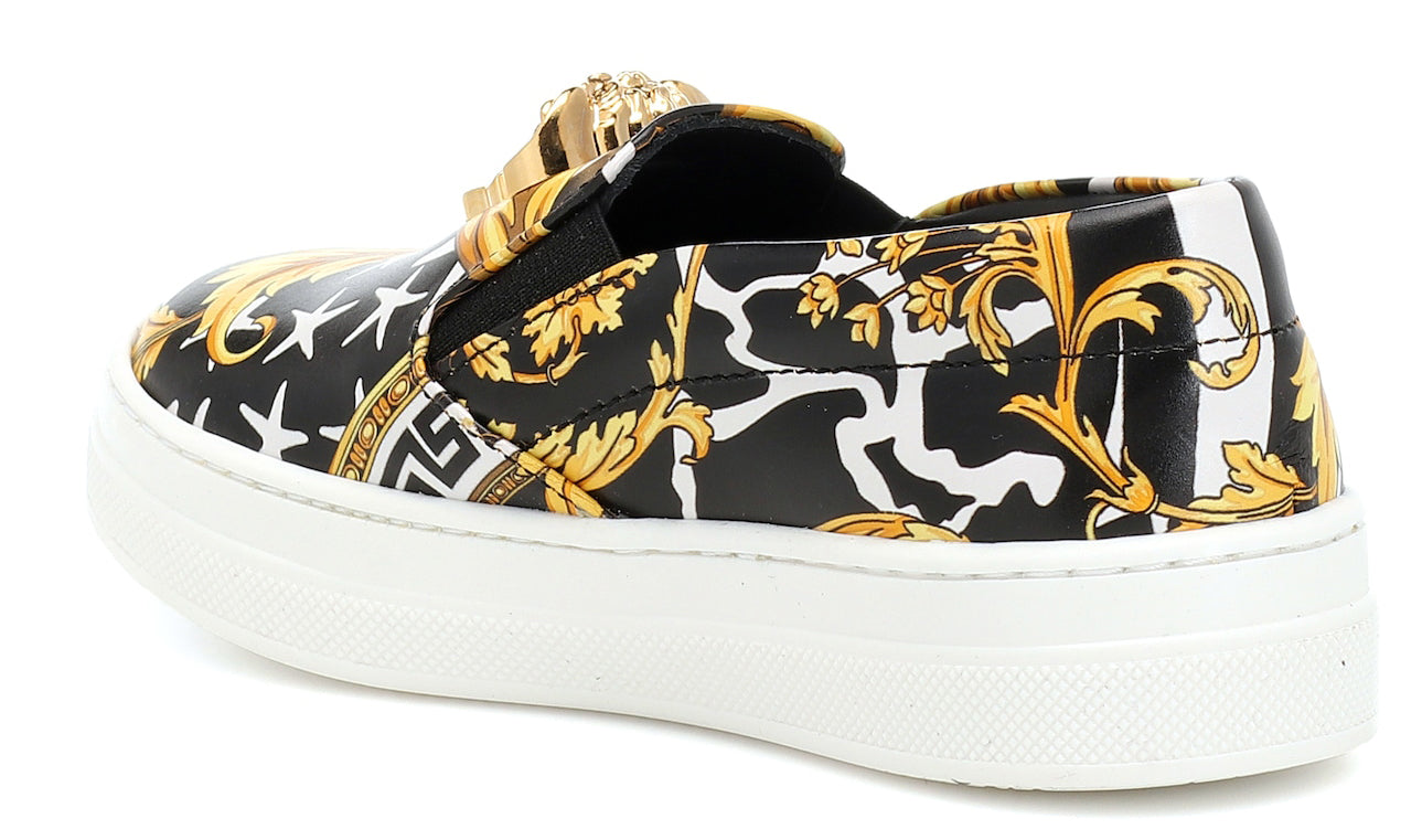Versace signature baroque print, these slip-on sneakers will become your little one's back-to-school favorite. The laid-back pair has been crafted in Italy from smooth leather that's set on a contrasting white rubber sole. We love the iconic Medusa heads, rendered in gleaming golden hardware, complete this design on an eye-catching note.