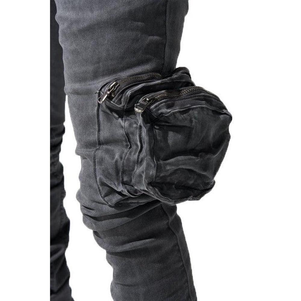 The "CEMENT" stacked cargo jean features the signature fitted denim construction, tapered at the thigh to the ankle, engineered with stretch material for comfortable fit. The iron grey fabric is designed to be individually unique and will vary.