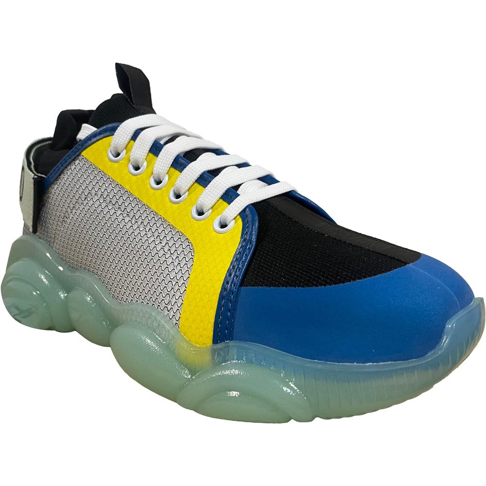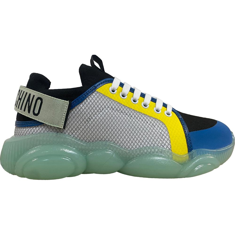 Different materials running sneakers, with logo strap on the back and Moschino Teddy Bear-shaped sole.