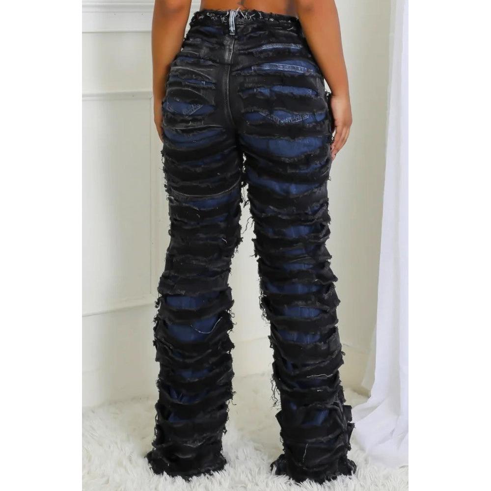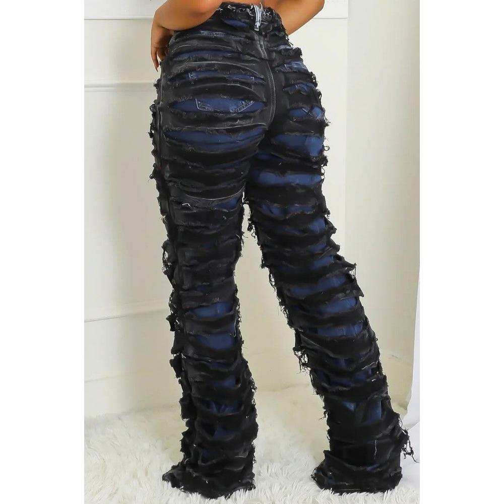 -High Rise -Double Layered -Duo Fabric -Front Layer Distressed -Blue And Black Contrast Washed -Inside Stretch / Outside Stretch -Front Back Functional Pockets -Wide Leg