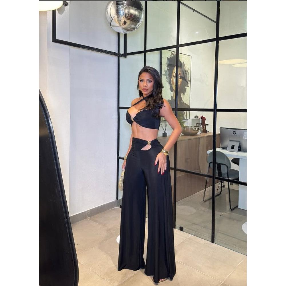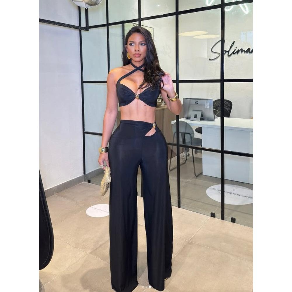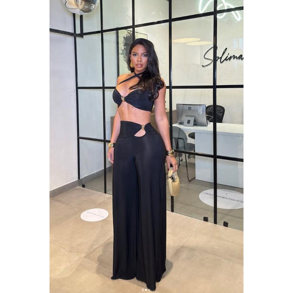Fiji Pant Set features a TRIM DETAIL high waisted, wide leg cut out pants with TUBE TRIM detail. Very stretchy.