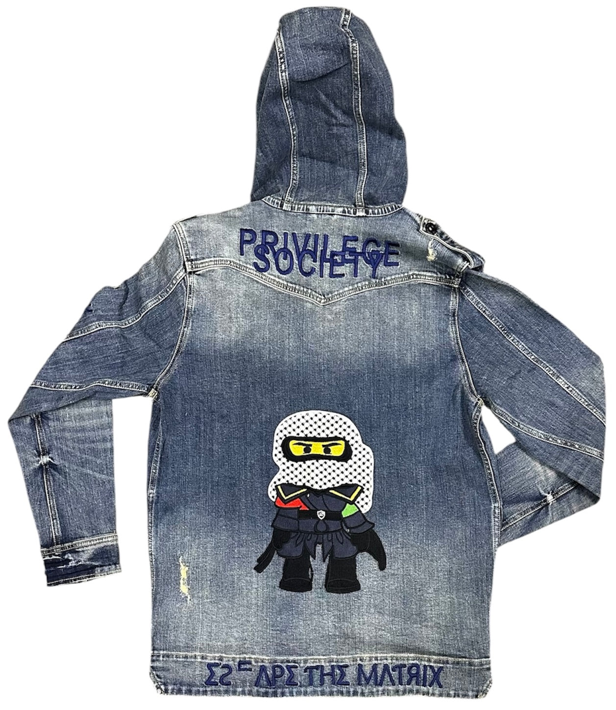 Meet the Vanguard Denim Hoodie Jacket: a breeze-wash denim piece with an attached hoodie, subtle sand-tone finish, and slight rips for added character. It features "IYKYK" embroidery on the left sleeve, a PS logo on the chest, and the Privileged Society name on the back. Perfect for those who appreciate a statement piece with refined details.